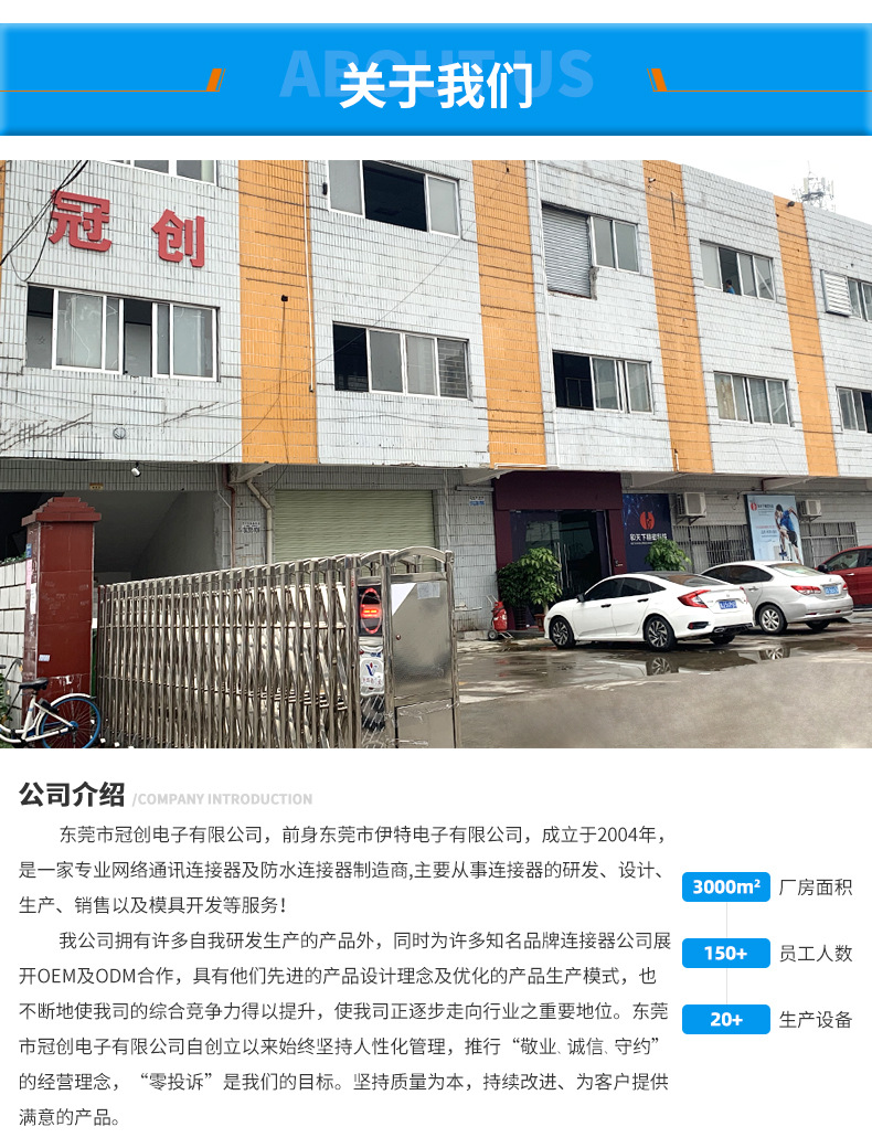 本公司提供優良的RJ11、RJ12電話插接件、RJ45網絡插接件,耐環境RJ45防水連接器,防水電連接器及其它精密連接器,產品應用于網絡通訊(電腦主板,網絡交換機,路由器,電信設備)、惡劣環境下數據傳輸與控制及電源信號傳輸與控制(戶外LED顯示屏、機器控制、工業程序控制等)